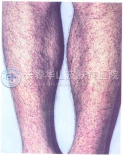 3.紫癜对称分布于四肢伸侧及臀部,可有斑丘疹、荨麻疹、血管神经性水肿,以至小血疱,可有坏死及溃疡,多次发作后留下色素沉着。